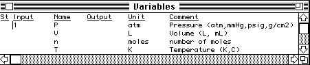 2. For each variable in the Variable Sheet, type in the units for which the rules hold in the Unit column. In this case, since we used a value of 0.082 liter-atm/K-mole for R, L must be in Liters, P in atmospheres, T in Kelvins, and n in number of moles. You can make up your own set of abbreviations for units, but you must be internally consistent.