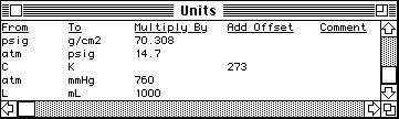 3. (Optional) Double-click on the Units icon to bring up the Units sheet. Type in any alternative units and the appropriate conversion factors. Your abbreviations for units must be consistent with what you typed in the units column of the Variable sheet.