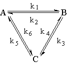 In the first workbook (ABC.XLS) the kinetic scheme for three simultaneous reversible reactions between reagents A, B and C is considered.