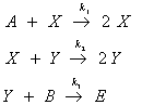 This scheme is used in biology as predator-victim model but it also has chemical analogue. Along the study of light hydrocarbons oxidation Frank-Kamenetzky have seen the periodical flashes and his kinetic model for this process is very similar to Lotka-Volterra ones.
