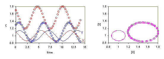 Oscillating chemical reactions are very interesting from the educational point of view. One of the model reaction of such type, based on the scheme, originally proposed by Lotka and Volterra, is considered in the last workbook (LOTKA.XLS).