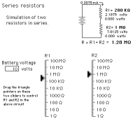 One of the problems in teaching electronics is the difficulty students have in moving back and forth between the static, two-dimensional symbolic representations of traditional schematic diagrams and the real, 3-dimensional circuits in the laboratory. My simulations help to bridge this gap by allowing the student to work with representations that look just like the schematic diagrams in their textbooks, yet actually work and respond to changes just like the real circuits. Using the mouse, you can drag sliders to control voltages and resistances, open and close switches, and type in the values of various components. The simulations use the laws of electricity (Ohn's Law, Kirchoff's Laws, etc) to display voltages and currents throughout the circuit dynamically in real time as the sliders are moved.
