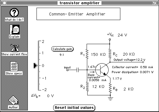 You can automate the calculation of the AC gain by pressing the "Calculate gain" button; this changes the base voltage by 0.1 volt, measures the resulting collector voltage change, and calculates the gain from that.