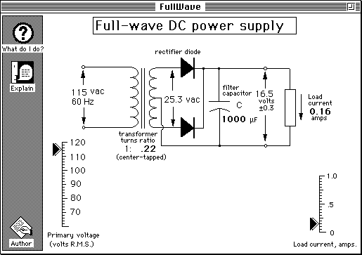 Use the left slider to adjust the AC line voltage and the right slider to adjust the DC current drawn from the power supply. You can also change the filter capacitance and the transformer turns ratio. Just click on the value with the mouse pointer and edit like any text field.