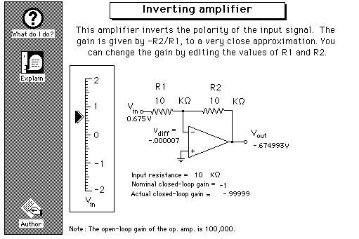 In this simulation you can change the values of R1 and R2 in order to change the gain (click on the resistor value with the mouse pointer and edit like any text field), and you can can vary the slider on the left to change the input voltage. As before, if you attempt to make the output voltage exceed the output voltage limits (+14 and -14 volts), the output will "saturate" at the limit until the input voltage is reduced. The gain equation is valid only if the amplifier is not saturated.