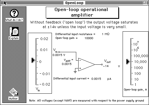 The differential input voltage (the voltage between the two input terminals of the op amp), Vdiff, is controlled by the slider on the left. The output voltage Vout = A*Vdiff. Because the open-loop gain A is so big, Vout is saturated unless Vdiff is very small. Note that the output voltage of an operational amplifier has definite voltage limits. In this case the limits are +14 volts and -14 volts. If you attempt to make the output voltage exceed those limits, the output will "saturate" at the limit until the input voltage is reduced.