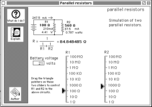 The two sliders control R1 and R2, respectively. As you vary R1 and R2, the voltages, currents, and power for both are calculated and displayed dynamically.