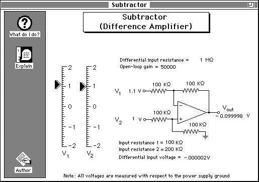 Adjust the two sliders on the left to change the input voltages to the circuit. The gain with respect to the two inputs can be changed by changing the two input resistors. When all the resistor values are equal, the output voltage is V2-V1. Resistor values much be well-matched for this circuit to work well. You can also change the differential input resistance (typically 1 to 100 Megohm) and and the open-loop gain (typically 50000 to 200000).