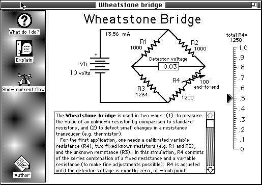 For the first application, one needs a calibrated variable resistance (R4), two fixed known resistors (e.g. R1 and R2), and the unknown resistance (R3). In this simulation, R4 consists of the series combination of a fixed resistance and a variable resistance (to make fine adjustments possible). R4 is adjusted until the detector voltage is exactly zero, at which point R3/R4=R1/R2. Usually, R1 is made equal to R2, so R3 = R4 at balance.