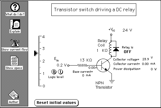 The voltage level of the input can be changed by sliding the black arrow- head up and down on this vertical scale. Changing the input voltage causes changes in the base current, collector current, and in the collector voltage. When the current in the relay coil (i.e. the collector current) exceeds a certain value, the relay switches on. The diode reduces the large transient voltages that are produced when the current through an inductor (the relay coil) is changed quickly by switching (called "inductive kick").