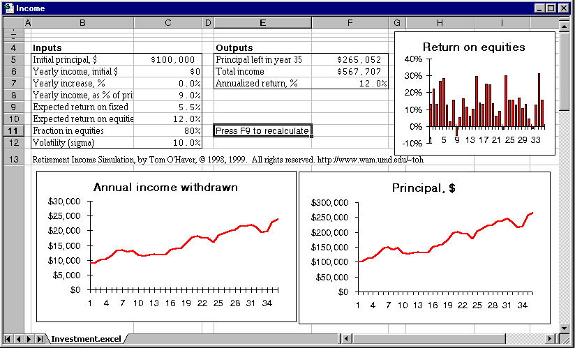 You can simulate the effect of these fluctuations by setting the "Volatility" variable to some non-zero value. Doing so will introduce some "bumpiness" in the principal curve (and in the income curve, if you are basing all or some of your income on a percentage of principal). Every time you recalculate the spreadsheet, another random set of returns is calculated. This is like simulating various alternative possible "futures". Every time you try out a different set of input variables, you should press F9 several time to observe how much your income varies.