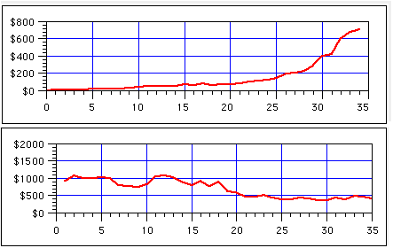 An obvious effect of fluctuation in investment returns is that it makes precise planning impossible. In fact, the effect of fluctuation is greater in your retirement years, when you are withdrawing income from your retirement accounts, than in your wealth-accumulation years, when you are contributing to to your retirement accounts. This is illustrated in the following graph, which shows a simulation of random fluctuating returns on investment principal for two scenarios. The top graph illustrates the wealth-accumulation years (calculated with the Investment Simulation Spreadsheet) and the bottom graph illustrates the retirement income years. The average annual return (10%) and standard deviation (15%) are identical for these two scenarios. The only difference is that in the top graph, regular contributions are made, while in the bottom graph, regular withdrawls are made. Clearly, the effect of volatility is much greater in the retirement income. This is one reason that retired persons are often advised to keep their principal invested in a balanced portfolio of conservative equity funds and fixed-return funds, in order to reduce volatility. People in their wealth-accumulation investment phase, however, can tolerate more volatility and can afford to invest more aggressively.