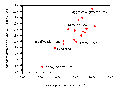 You can simulate the effect of investing in these types of funds by using these values to set the "Equity Return" and "Volatility" variables. (In the WingZ version, full-scale on the Volatility slider represents a standard deviation of 60%. The standard deviation is displayed at the top right of the slider). Question: based on the mutual fund data list in this table, which of these fund types would allow the greatest annual income to be withdrawn without significant risk of going broke before year 35?