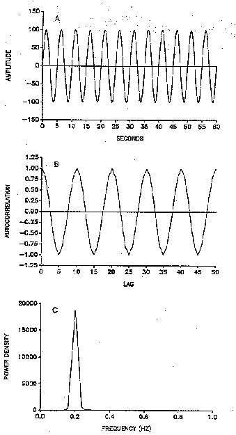 A number of parameters are necessary to describe a periodic process. In Figure 1a the sine wave takes on values from -100 to +100. The peak of the periodic process is called the amplitude. In Figure 1a the amplitude is 100. In psychophysiological research we are often interested in quantifying the variance of the signal. In conceptualizing variance of a periodic process, it is useful to recall the arithmetic relationship between amplitude and variance. The square of the amplitude divided by two is equivalent to the variance [var = A(squared)/2]. Thus, decomposition of physiological processes into sine waves would provide a method of describing component variances of the different periodic processes. This method of decomposition is the basis for spectral analysis and will be described in the section on frequency domain analyses.