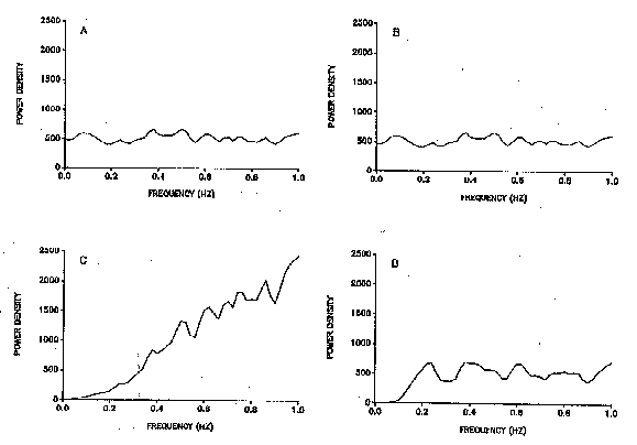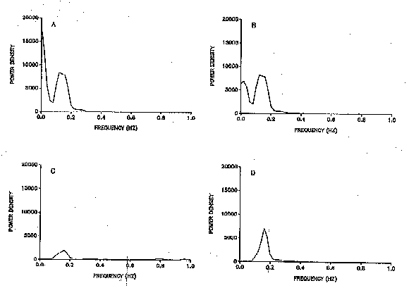 Similar to the above example, we can apply the various filtering procedures to the heart period data illustrated in Figures 3a and 8a. In Figure 17a the spectrum of the undetrended data are characterized by spectral densities at the lowest frequency and by the broad peak in the respiratory frequency band. In Figure 17b the spectrum for the linear detrended data are characterized by an attenuation of the deterministic component at the lowest frequency confirming that the data were non- stationary and had a major linear trend. The respiratory peak remains broad. In Figure 17c the spectrum for the successive differenced data demonstrate the impact of the filters transfer function. The low frequencies have been totally rejected and although the peak frequency is more similar to the peak of the respiratory spectrum illustrated in Figure 2c and 8c, the amplitude of the peak has been greatly attenuated. In Figure 15d the spectrum for the moving polynomial filtered data is illustrated. Note the rejection of low frequency components and the accurate manifestation of the amplitude and frequency of the higher frequency components.