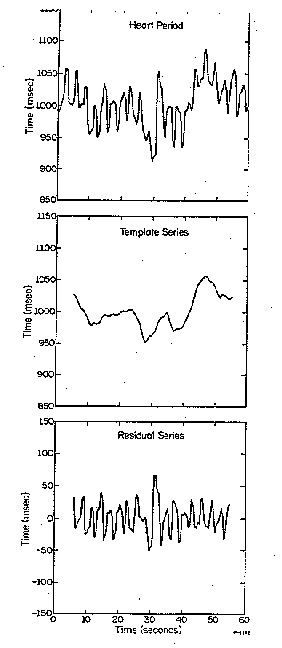 Figure 12 illustrates how the moving polynomial procedure functions. The top panel illustrates 60 seconds of heart period data sampled every 500 msec. from a healthy adult. Note the rhythmic oscillations occurring approximately 20 times within the 60 second data set. This oscillation is respiratory sinus arrhythmia. A graph of simultaneously recorded respiration (e.g., Figure 8a) would reflect the same periodicity.