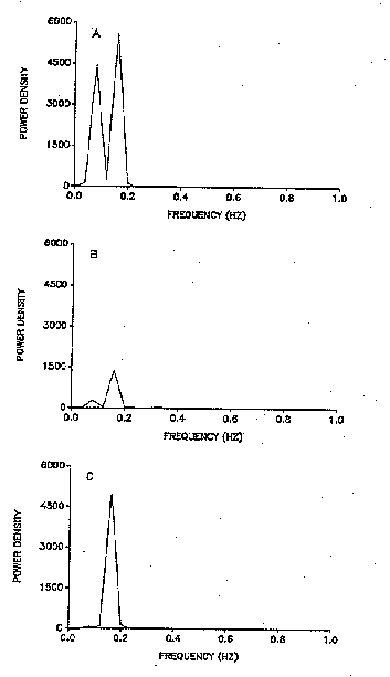 Figure 11d illustrates the impact of a cubic moving polynomial filter with a duration of 10.5 seconds on the white noise time series. Note that the spectral densities at the low frequencies are totally rejected and the high frequencies are not amplified. The theoretical transfer function for this filter indicates slight attenuation at the low end of the respiratory frequency band (i.e., 0.12 Hz and 0.14 Hz) and fidelity at frequencies above .16 Hz. Although longer duration polynomials would provide greater fidelity of a sine wave at the slow respiratory frequencies, it would compromise the analysis by passing influences of slower periodic processes such as the Traube-Hering-Mayer wave. In fact, it has been demonstrated that with extremely slow breathing, respiratory sinus arrhythmia and the Traube-Hering-Mayer wave merge and become extremely difficult to interpret (Kitney, 1986). The attenuation of respiratory sinus arrhythmia at the slowest respiratory frequencies is of little concern and has only negligible impact on estimates of respiratory sinus arrhythmia, because respiratory sinus arrhythmia occurs over a band of frequencies and the spectral densities are windowed.