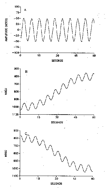 To illustrate the impact of detrending on the peak-to-trough measure, we have applied various methods to the ascending time series illustrated in Figure 18b. Figure 19a represents the time series with the linear trend removed. Although a major influence of trend is removed, the impact of the trend is still visible and is reflected in the variability in the peak-to-trough measures which range between 127 msec. and 88 msec. Figure 19b depicts the time series detrended by successive differences. Note the massive attenuation and variability of the peak-to-trough measure. Figure 19c illustrates the time series detrended by the moving polynomial filter. Note the stable and accurate representation of the peak-to-trough characteristics of the original sine wave (see Figure 18a).