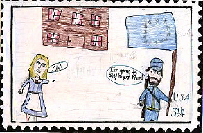 This stamp shows a lady telling a solider that he can't stay in her home.