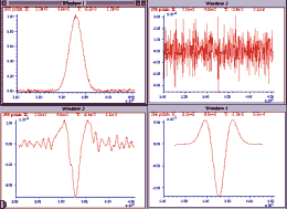 vector, correcting for non-uniform x-axis intervals). These statements generate the 4th derivative of a Gaussian peak and display it in iSignal. You'll need to download isignal.m, gaussian.m, and deriv4.m. >> x=[1:.1:300]'; >> isignal(x,deriv4(100000.*gaussian(x,150,50)+.1*randn(size(x)))); The signal is mostly blue noise (because of the differentiated white noise) unless you smooth it considerately. Use the A and Z keys to increase and decrease the smooth width and the S key to cycle through the available smooth types. Hint: use the Gaussian smooth and keep increasing the smooth width. The script "iSignalDeltaTest" demonstrates the frequency response of the smoothing and differentiation functions of iSignal by a applying them to a delta function. Change the smooth type, smooth width, and derivative order and see how the power spectrum changes. Real-time