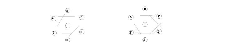 2. The labels from four bottles (A, B, C, and D) of hapten-carrier conjugates were accidentally removed. However, it was known that each bottle contained either hapten 1- carrier 1 (H1-C1), hapten 1 – carrier 2 (H1-C2), hapten 2 – carrier 1 (H2-C1), or hapten 2 – carrier 2 (H2-C2). Ouchterlony assays with either anti-H1-C2 or anti H2-C2 were performed. From the precipitin patterns shown below, determine which conjugate is in each bottle.