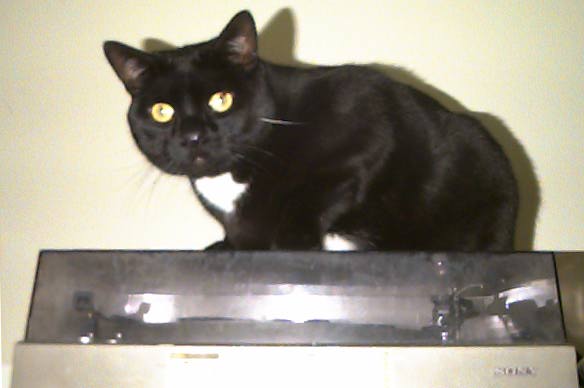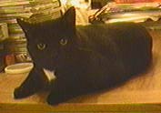 [is] was an altered male, about 20 pounds, who came to me when the apartment complex his former owners lived in (which did not allow pets) hired a maintenance man who was allergic to cats and became a walking cat-detector. He likes eating and going out on the fourth-floor balcony to survey his domain. He is a morning person and walks on me to wake me up. His favorite spot is on top of the stereo. He is all black except for white chest, groin, and rear feet.